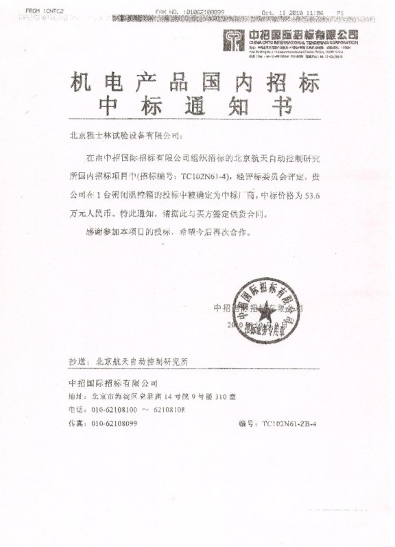 金秋十月,秋高氣爽!由中招國(guó)際招標(biāo)有限公司精心組織,在北京航天自動(dòng)控制研究所2010年國(guó)內(nèi)項(xiàng)目二期招標(biāo)中,北京雅士林試驗(yàn)設(shè)備有限公司憑借強(qiáng)大的綜合實(shí)力,以各項(xiàng)排名指標(biāo)均名列前茅的優(yōu)異成績(jī)成功中標(biāo)密閉溫控箱(招標(biāo)編號(hào):TC102N61-4)項(xiàng)目工程。中標(biāo)金額為53.6萬(wàn)元人民幣。