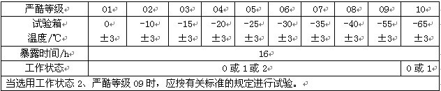 恒溫恒濕試驗箱試樣在恒應(yīng)力狀態(tài)暴露期間,溫度變化應(yīng)十分緩慢以防止試樣損壞。用條件試驗方法11或12時,溫度變化階段應(yīng)保持最大的相對濕度,并在有關(guān)標準中說明試樣上是否允許出現(xiàn)凝露。恒溫恒濕試驗箱適用于航空航天產(chǎn)品、信息電子儀器儀表、材料、電工、電子產(chǎn)品、各種電子元氣件在高低溫或濕熱環(huán)境下、檢驗其各性能項指標。 條件試驗10方法:低溫(下圖為條件試驗方法10低溫的嚴酷等級表)