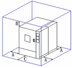 9、高低溫試驗箱周圍應留有適當的使用及維護空間,如下圖所示:注:A:不小于60cm  B:不小于60cm C: 不小于70cm