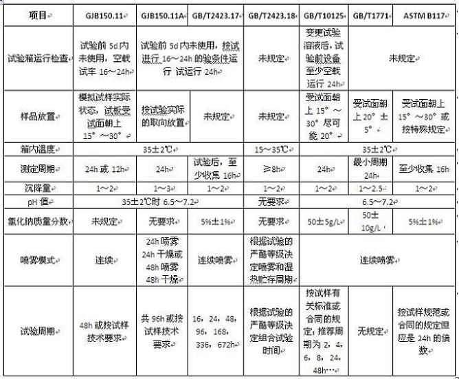 鹽霧試驗箱要保證試驗結(jié)果的正確性,必須控制好試驗過程。試驗過程的控制包括:試驗箱運行檢查、樣品放置、箱內(nèi)暴露區(qū)溫度、沉降液的參數(shù)(沉降量、PH值和氯化鈉質(zhì)量濃度)等,不同標(biāo)準(zhǔn)對鹽霧試驗過程的控制要求見下表:
