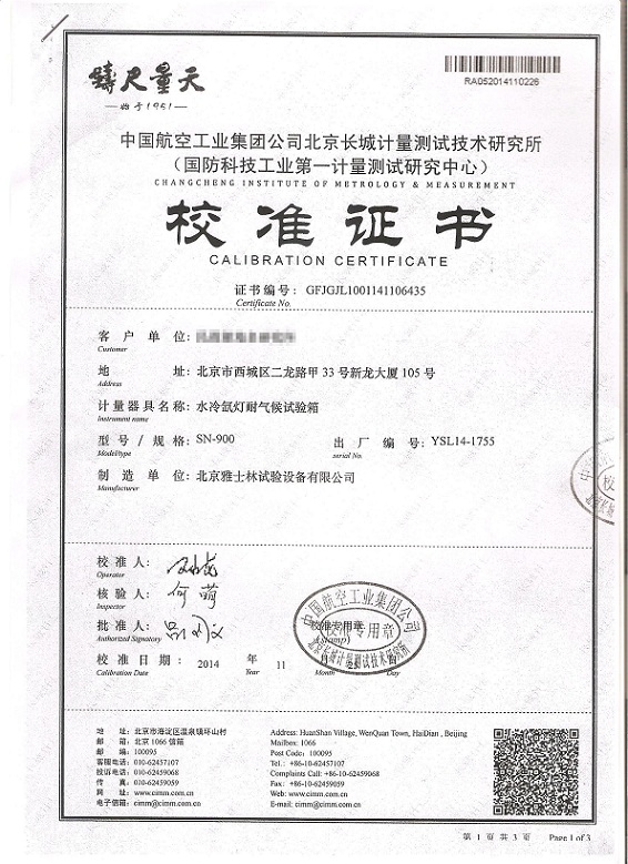 >>氙燈老化試驗箱校準證書模板下載—北京長城計量所